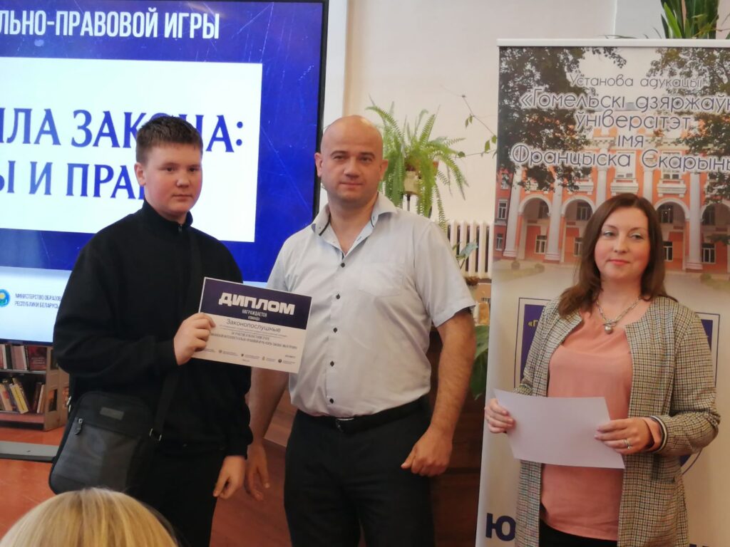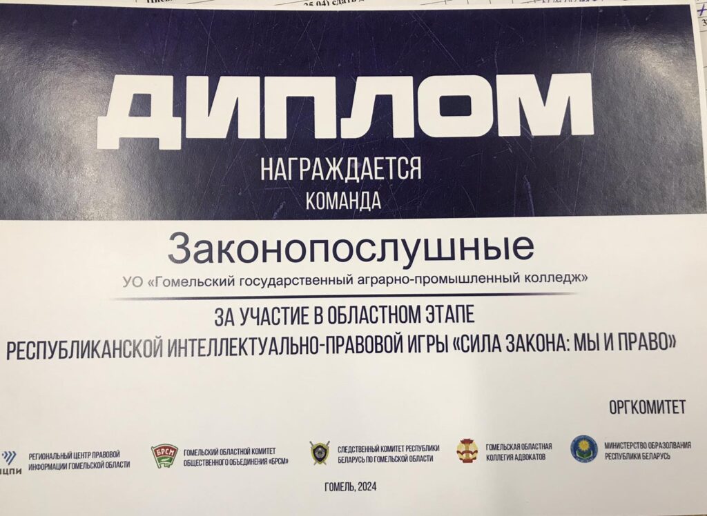 С целью правового просвещения молодежи, направленного на повышение их интереса к законодательству, 16.05.2024 команда нашего колледжа приняла участие в интеллектуально-правовой игре «Сила Закона: мы и право» на базе УО » Гомельский государственный университет им. Ф. Скорины». В игре учавствовали колледжи и университеты Гомельской области. Все учащиеся выполнили с особым старанием и интересом предложенные задания. После подведения итогов команды получили заслуженные награды.