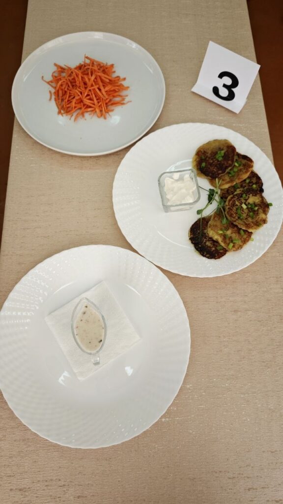 Жребий определил конкурсные задания: участникам предстояло показать мастерство нарезки соломкой, технику приготовления классического соуса бешамель и национального блюда — белорусских драников. Но главным испытанием стала презентация — каждое блюдо на тарелке должно было выглядеть как произведение современного искусства.