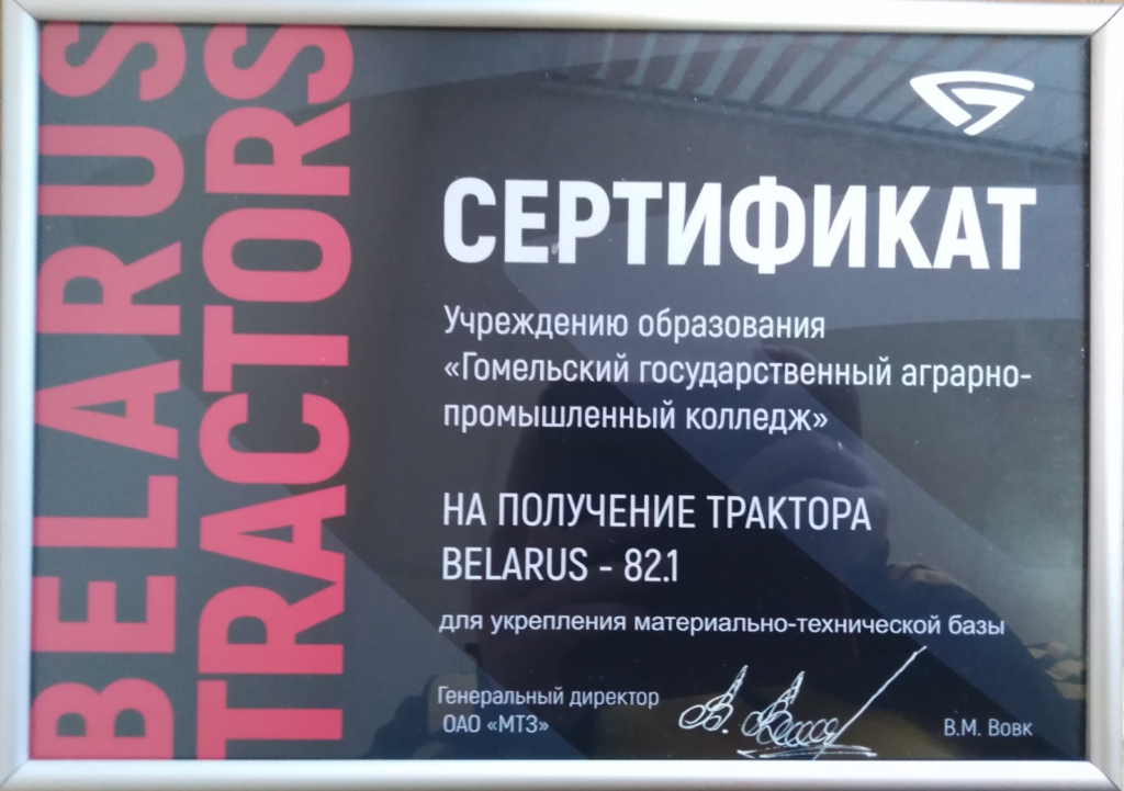 Приятно отметить, что директору нашего колледжа Гришану Ю.Г. был вручен сертификат на получение трактора Беларус-82.1 за подписью генерального директора ОАО «МТЗ» В.М.Вовка.